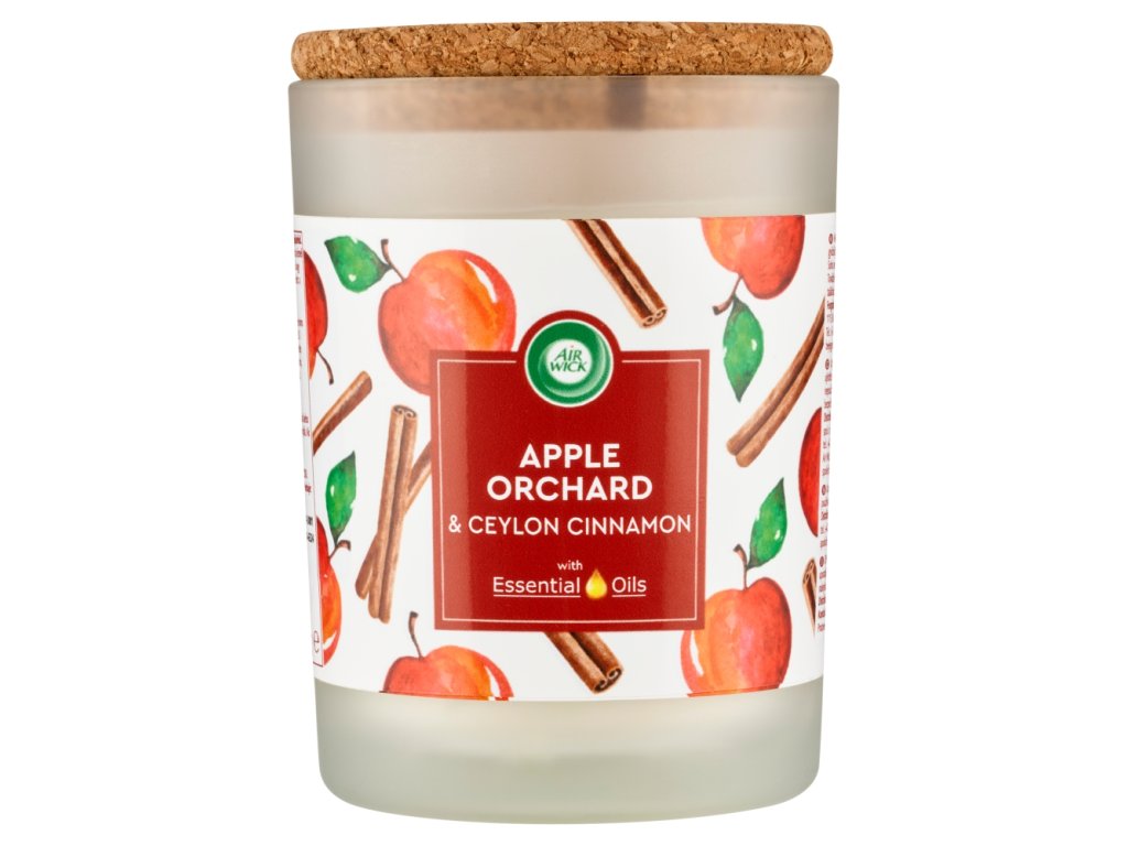 Air Wick Duftkerze mit ätherischen Ölen, Apfelgarten & Ceylon-Zimt, 185 g ist eine Duftkerze, die den Duft von saftigen Äpfeln und Ceylon-Zimt kombiniert und so eine angenehme und warme Atmosphäre in Ihrem Zuhause schafft.