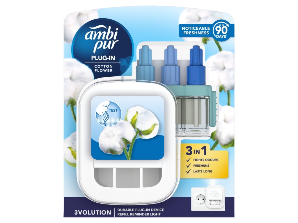 Ein von Frische inspirierter Duft reines Weiß Baumwolle . Ambi Pur 3volution verwendet 3 verschiedene Düfte, die harmonisch ineinander übergehen . Die Düfte schalten sich alle 45 Minuten separat ein. Ambi Pur 3Volution gibt es in drei verlockenden Starter- und Nachfüllvarianten. Die Duftintensität lässt sich am Gerät einstellen, und die langsam aufleuchtenden LEDs zeigen an, welcher Duft gerade aktiv ist. Ambi Pur 3Volution, der erste Lufterfrischer, an dem Sie immer wieder Freude haben werden. Es hält 90 Tage bei täglicher 12-stündiger Anwendung und minimaler Duftintensität.