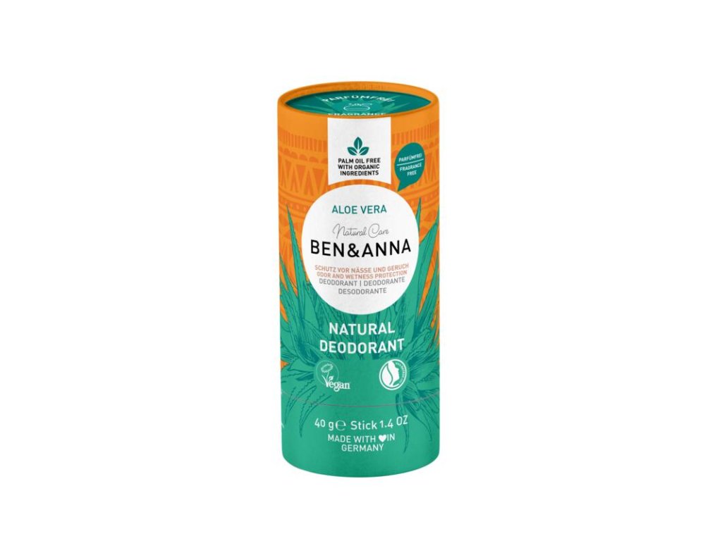 Empfindliche Haut: Die festen Deodorants von Ben&Anna auf Basis von Natron und Sheabutter sind natürlich, 100 % vegan, tierversuchsfrei und komplett plastikfrei – sie werden in einer recycelbaren Papiertube (mit FSC-Zertifizierung) verpackt. Sie enthalten keine Aluminiumsalze, Parabene, chemischen Stabilisatoren, PEGs, Phthalate oder Gluten. Sie reduzieren und verhindern Schweißgeruch und halten die Achseln trocken und duftend. Sie sind sowohl für Frauen als auch für Männer geeignet. Die Variante mit ALOE VERA ist komplett parfümfrei und daher für empfindlichere Haut geeignet. Darüber hinaus unterstützt die Marke Ben&Anna die Organisation One Earth – One Ocean, deren Initiative es ist, die Meere von Plastikmüll zu reinigen. Ben&Anna ist stolz auf die Zertifikate VEGAN und NATRUEZusätzliche Parameter