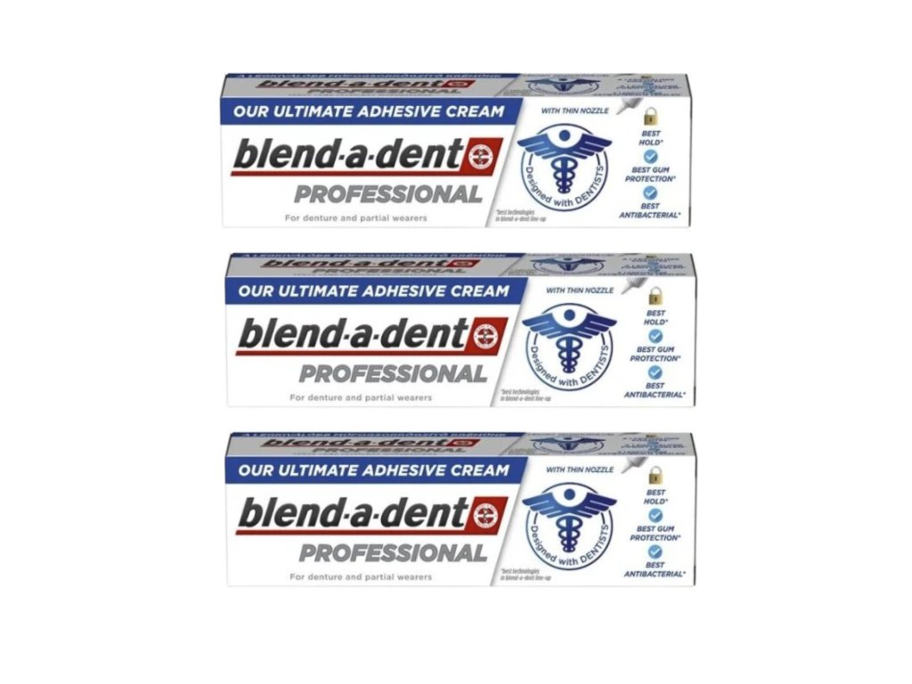 Blend-a-dent Professional ist die fortschrittlichste Haftcreme für Zahnprothesen im Blend-a-dent-Sortiment. Ihre spezielle Formel bietet bis zu 75 % stärkeren Halt als herkömmliche Haftcremes und sorgt so für einen festen, sicheren und komfortablen Sitz der Prothese – den ganzen Tag lang.