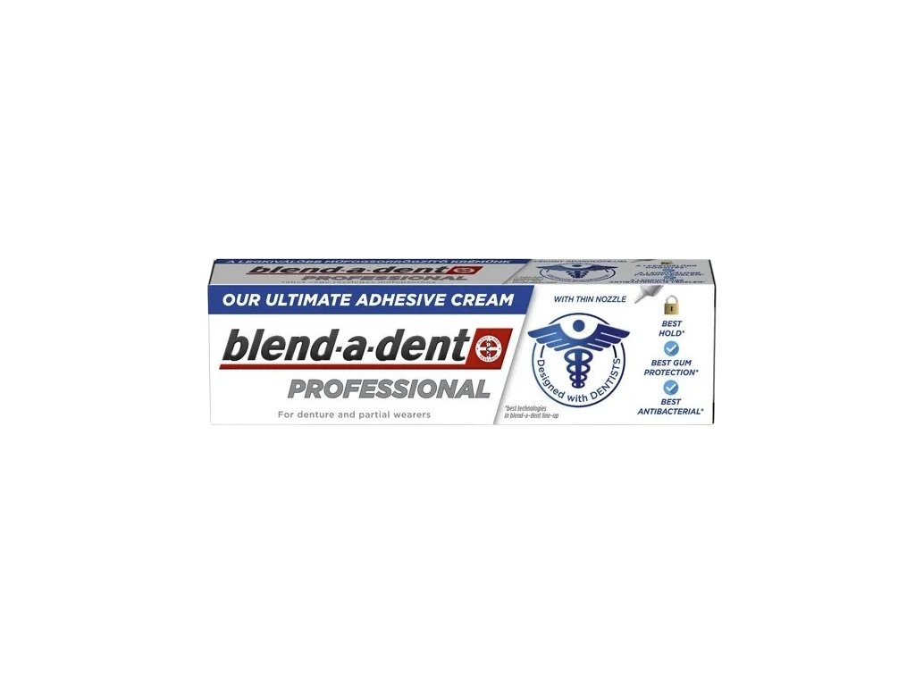 Blend-a-dent Professional ist die fortschrittlichste Haftcreme für Zahnprothesen im Blend-a-dent-Sortiment. Ihre spezielle Formel bietet bis zu 75 % stärkeren Halt als herkömmliche Haftcremes und sorgt so für einen festen, sicheren und komfortablen Sitz der Prothese – den ganzen Tag lang.