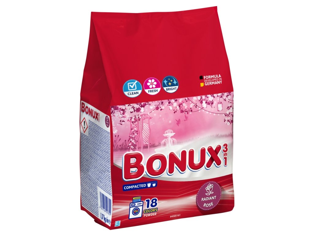 Das Waschpulver Bonux Color enthält aktive Partikel für perfekteres Waschen, Fleckenentfernung und eine Komponente, die Kalkablagerungen verhindert.