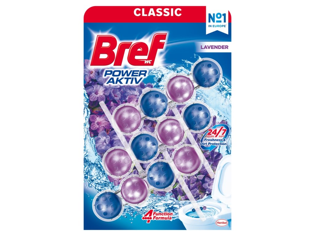 Bref Power Aktiv: besteht aus 4 Kugeln, die in einem transparenten, nicht abnehmbaren Korb aufbewahrt werden und bei jeder Spülung mehrere Funktionen erfüllen – hygienische Sauberkeit, angenehmer Duft, Entfernung von Ablagerungen und Bildung von reichhaltigem Schaum für Glanz und Weiße der Toilette.