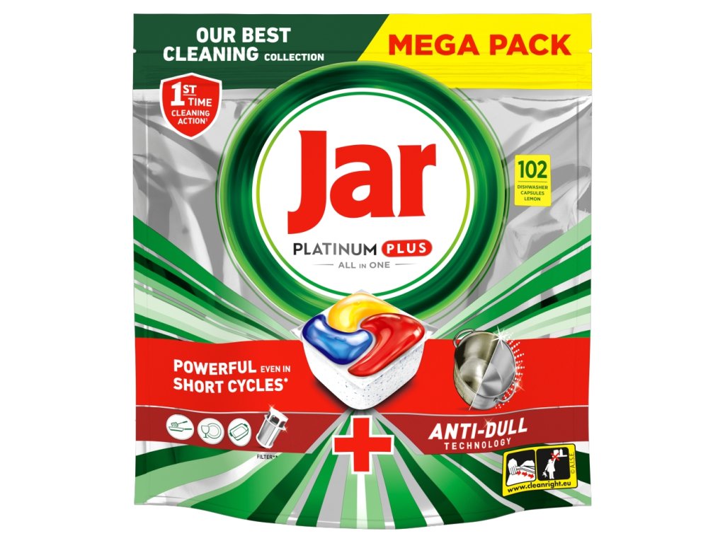 Die Jar Platinum Plus All-in-One -Geschirrspülerkapseln für Automatik sorgen dafür, dass Ihr Geschirr so sauber wie neu ist. Sie garantieren die beste Reinigungsleistung von Jar und helfen sogar dabei, mit der Zeit entstehenden Grauschleier zu entfernen und Ihrem Geschirr seinen ursprünglichen Glanz zurückzugeben. Jar Platinum Plus-Kapseln haben ein integriertes Vorspülsystem , sodass Sie Ihr Geschirr nicht selbst vorspülen müssen. Mit Jar Platinum Plus-Kapseln müssen Sie Ihr Geschirr nicht vorspülen, wodurch Sie Wasser sparen und die Umwelt schonen. Jar kombiniert flüssiges und pulverförmiges Geschirrspülmittel in einer wirksamen Kapsel. Die hochlösliche Verpackung löst sich schnell auf und funktioniert auch bei kurzen Spülgängen gut, sodass das Geschirr sofort gespült wird. Und die Kapseln sind ganz einfach zu verwenden. Sie müssen die Kapsel nicht auspacken, sondern können sie einfach in das Spülmittelfach legen .
