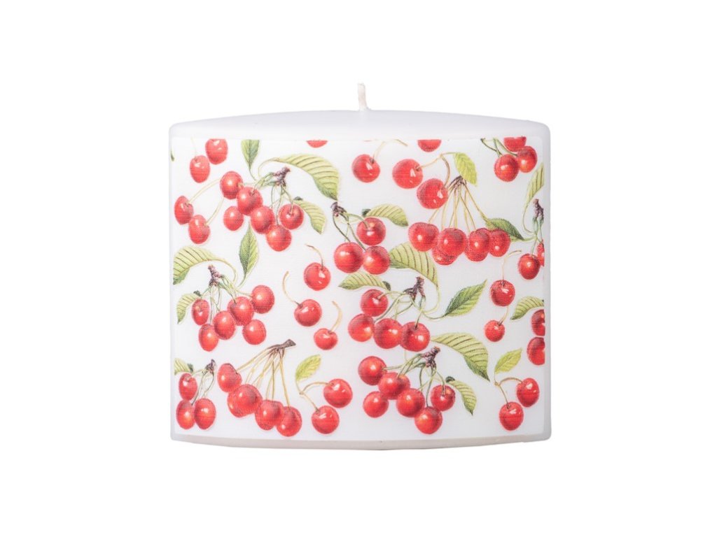 Eine ellipsenförmige Kerze mit Schwarzkirschmotiv. Dank ihres eleganten Aussehens und des natürlichen Musters ist sie ideal, um Ihrem Interieur eine stimmungsvolle Atmosphäre zu verleihen. Ihre Maße sind 115 x 53 x 100 mm.