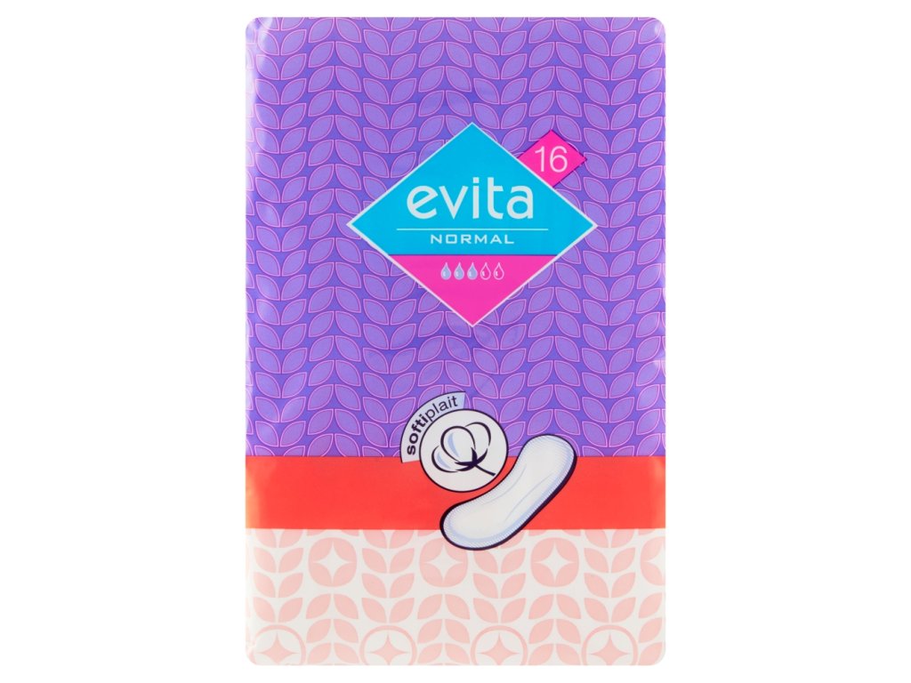 Evita Normal Damenbinden. Traditionelle Damenbinden ohne Seitenflügel, überzogen mit feiner Softiplait-Faser für ein angenehmes und weiches Gefühl. Die Isolierfolie schützt vor Flüssigkeitsaustritt.