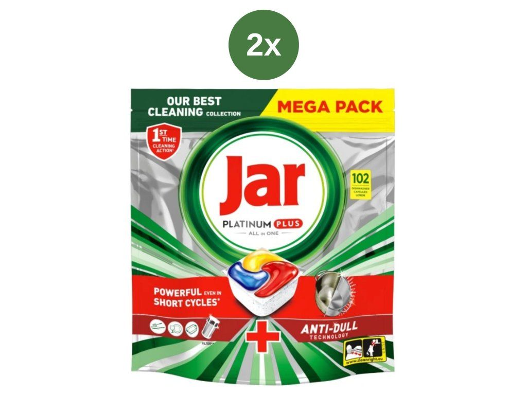 Die Jar Platinum Plus All-in-One Geschirrspülkapseln sorgen für strahlend sauberes Geschirr wie neu. Sie garantieren die beste Reinigungsleistung von Jar und helfen sogar, mit der Zeit entstehende Vergrauungen zu entfernen und den ursprünglichen Glanz Ihres Geschirrs wiederherzustellen. Die Jar Platinum Plus Kapseln verfügen über ein integriertes Vorwaschsystem , sodass Sie Ihr Geschirr nicht mehr selbst vorspülen müssen. Mit den Jar Platinum Plus Kapseln sparen Sie Wasser und schonen die Umwelt. Jar kombiniert flüssiges und pulverförmiges Geschirrspülmittel in einer effektiven Kapsel. Die hochlösliche Verpackung löst sich schnell auf und wirkt auch bei kurzen Spülgängen optimal, sodass der Spülvorgang sofort beginnen kann. Die Kapseln sind kinderleicht zu verwenden: Einfach in die Spülmittelkammer geben , fertig!