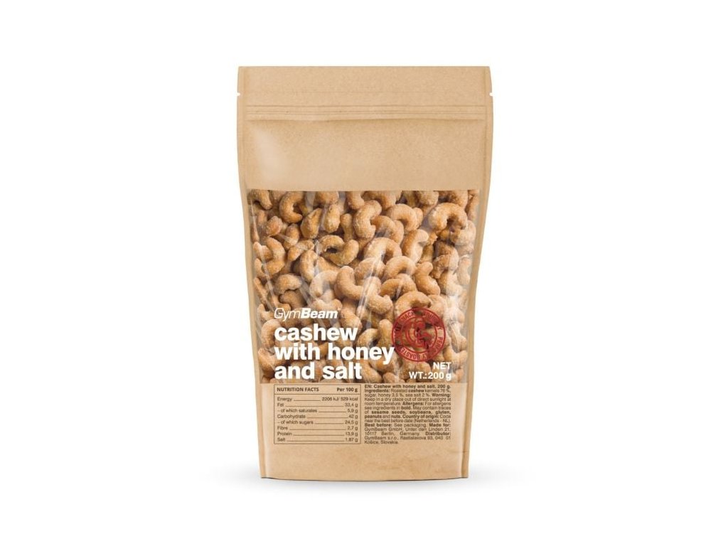 Geröstete Cashewkerne 76 %, Zucker 18,5 %, Honig 3,5 %, Meersalz 2 %.