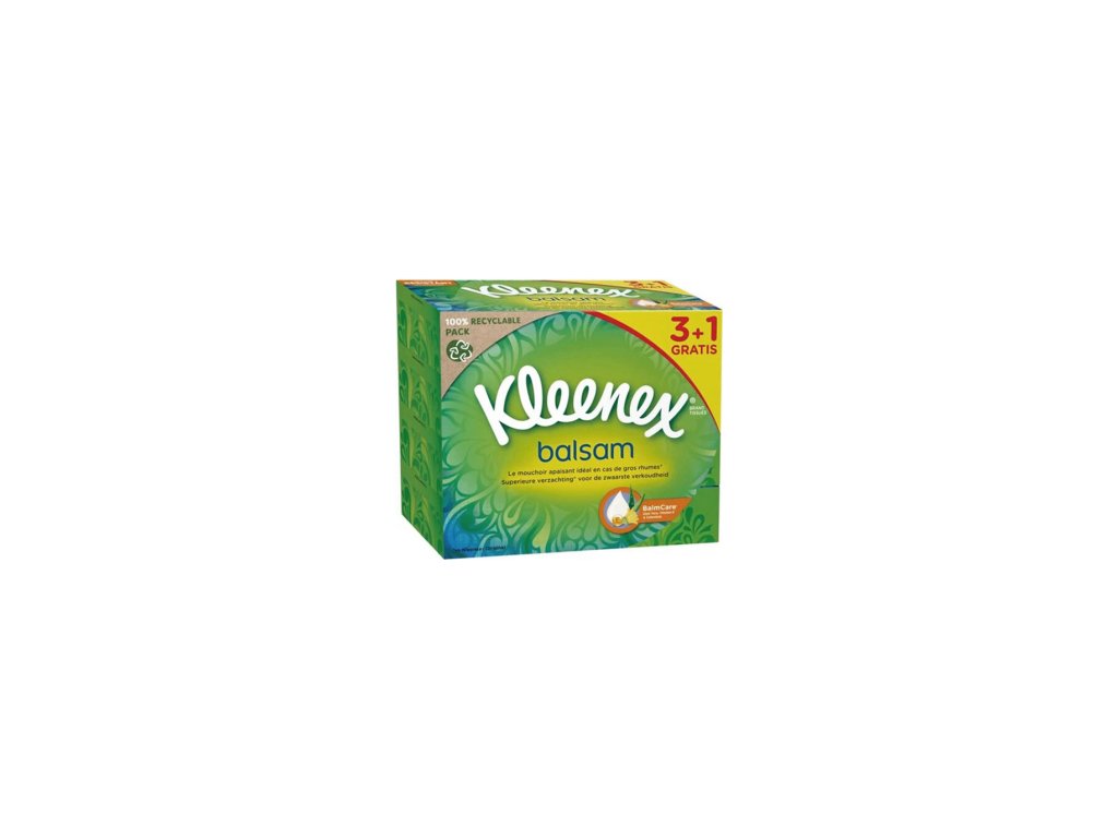 Kleenex Balsam 3-lagige Papiertaschentücher in einer Box, 4× 64 Stück, 3+1