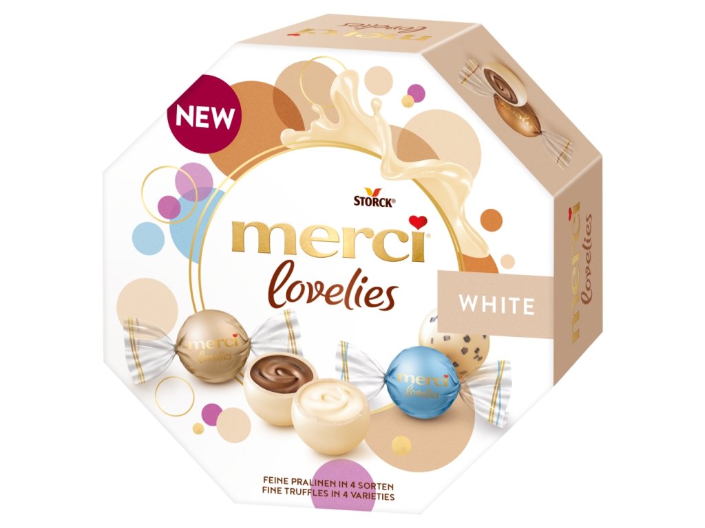 Geschenkbox mit 14 einzeln verpackten Pralinen. 4 Sorten. Ein wahrer Traum in Weiß! Verschenken Sie Ihre Liebsten mit den leckeren Merci White Lieblingen. Sie haben einen angenehm milden Geschmack und eine Hülle aus weißer Schokolade. Die knusprigen Kugeln zergehen zart auf der Zunge und verströmen gleichzeitig das köstliche Aroma der Füllung. Ein volles Geschmackserlebnis für anspruchsvolle Naschkatzen.