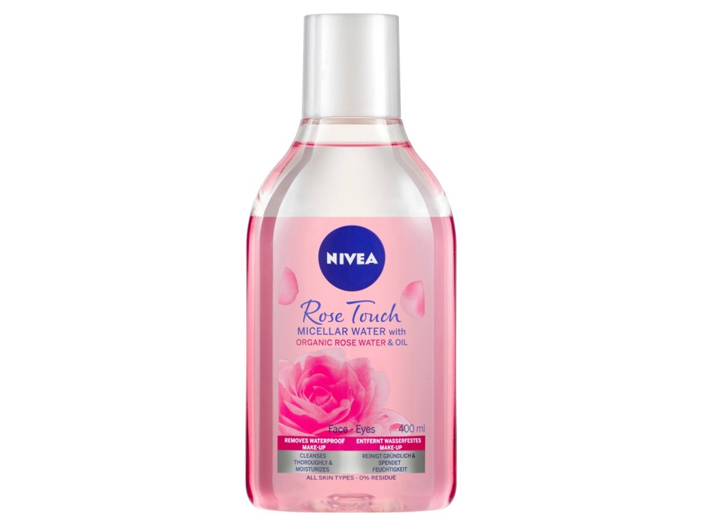 Nivea® Rose Touch Bi-Phase Reinigungs-Mizellenwasser mit Öl und Bio-Rosenwasser: 1. Entfernt sanft selbst wasserfeste Mascara ohne Reiben oder Abspülen. 2. Reinigt und strafft die Haut gründlich, trocknet sie nicht aus. 3. Spendet sofort Feuchtigkeit und erhält diese 24 Stunden lang.