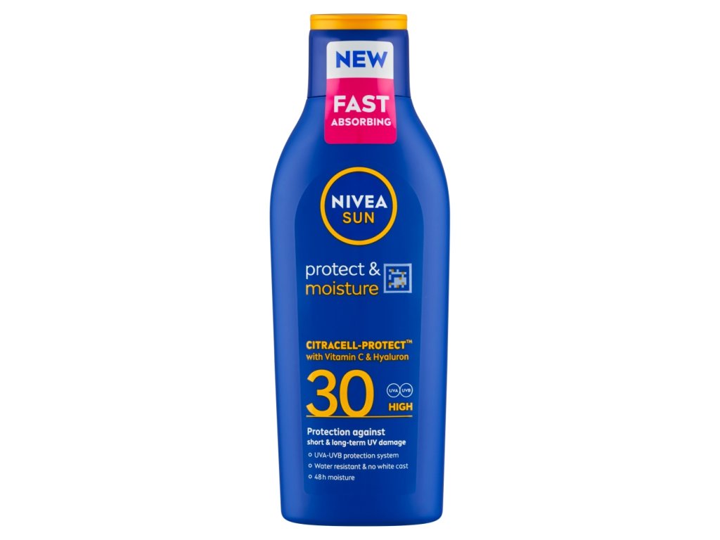 Unsere Haut ist von der Sonne schön gebräunt, aber oft auch ausgetrocknet. Zum Glück gibt es sanfte Pflege, die die Haut nicht nur intensiv schützt , sondern ihr auch Feuchtigkeit spendet . Die wirksame Kombination aus UVA- und UVB-Filtern beugt Sonnenbrand und Hautalterung vor und reduziert das Risiko von Sonnenallergien. Die einzigartige Zusammensetzung sorgt zudem dafür, dass Sonnencremeflecken nach dem Waschen weniger sichtbar sind. Sanfte Feuchtigkeitsspender machen die Haut geschmeidig – NIVEA Feuchtigkeitsspendende Sonnenlotion 30 ml .