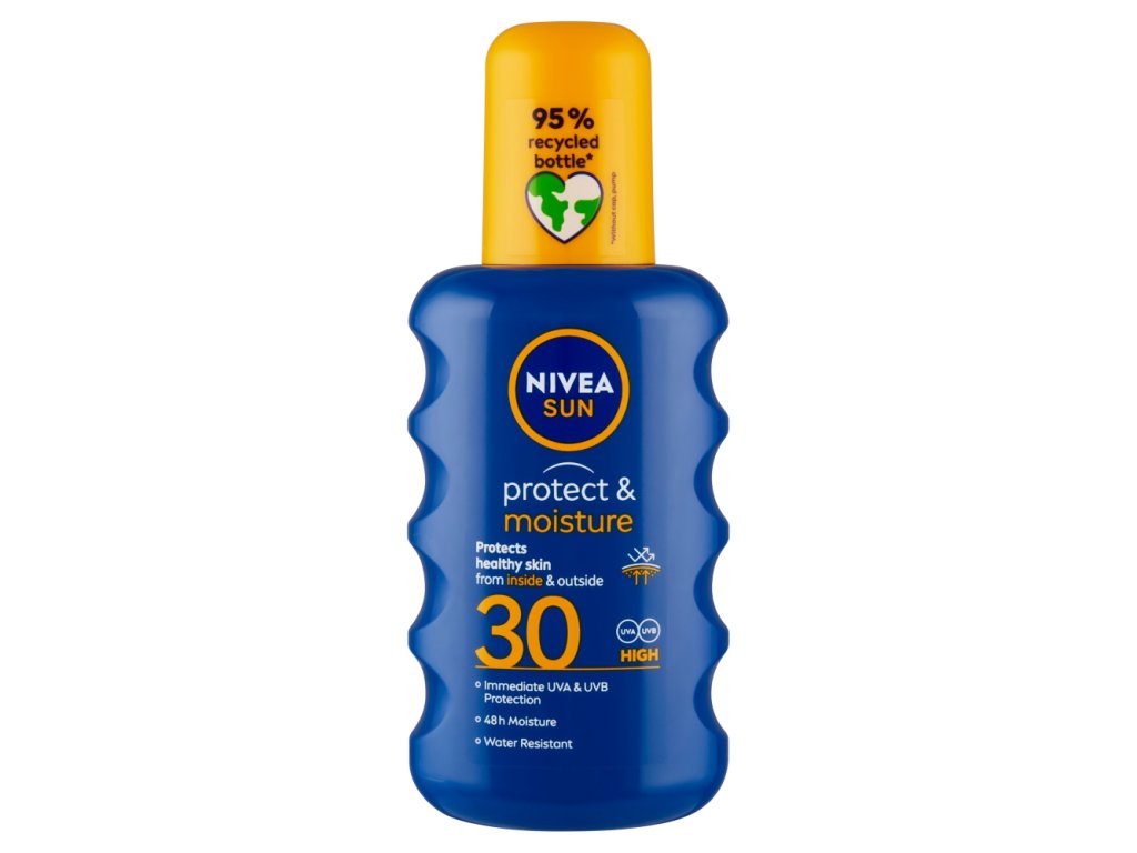Sonnenbaden ohne Sorgen! Die pflegende Formel mit einem ausgewogenen System aus UVA- und UVB-Filtern schützt die Haut sofort vor Sonnenbrand und vorzeitiger sonnenbedingter Hautalterung. Sie spendet der Haut langanhaltende Feuchtigkeit und macht sie geschmeidig. Die einzigartige Formel sorgt dafür, dass Sonnenflecken nach dem Waschen weniger sichtbar sind. Dank des Sprays ist die Anwendung zudem kinderleicht! So wird Ihre Haut geschützt – NIVEA Moisturizing Sun Spray OF 30 .