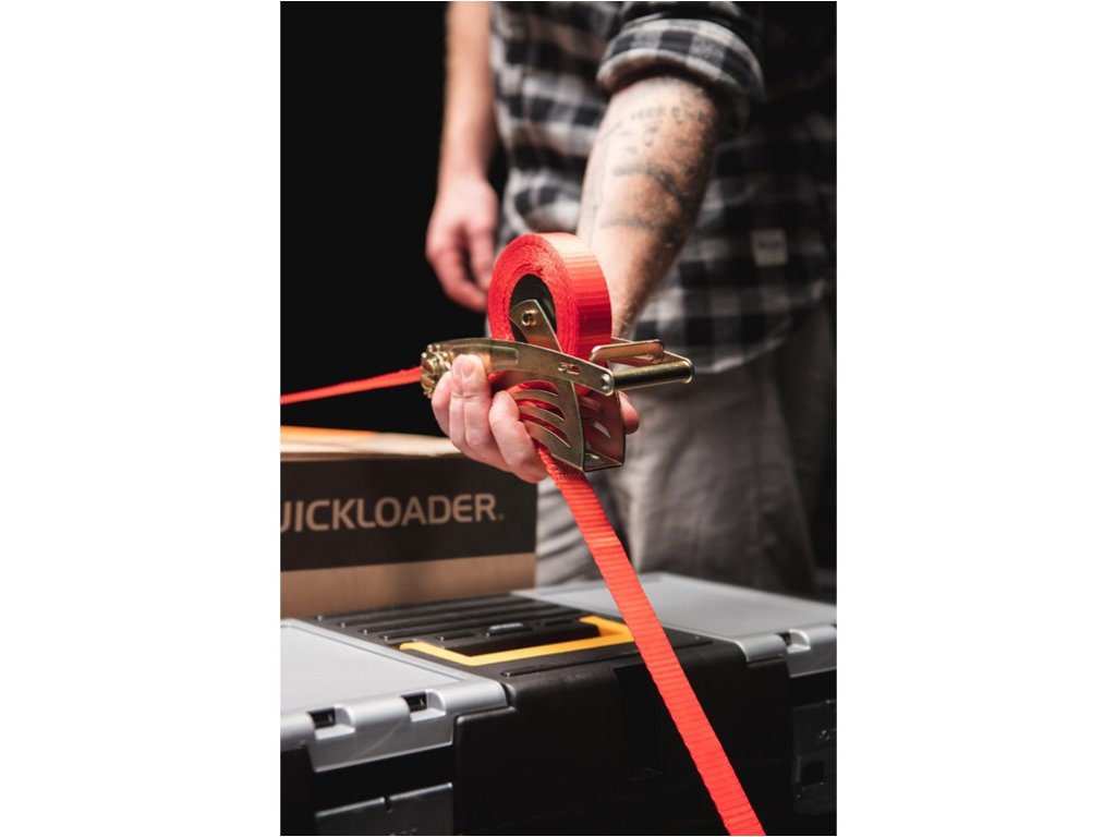 Das QUICKLOADER®-Sicherungssystem mit einer Tragfähigkeit von bis zu 2000 kg und einer Länge von 5 m (0,8 bis 4,2 m) ist für den professionellen Einsatz beim Transport schwerer Lasten konzipiert. Mit einer Breite von 35 mm und seiner robusten Konstruktion eignet es sich hervorragend zur Sicherung von Baumaterialien, Maschinen, Geräten oder Paletten – beispielsweise auf Anhängern, Pritschenwagen oder in Lkw. Der automatische Aufrollmechanismus arbeitet auch unter rauen Bedingungen zuverlässig – er verstopft nicht und ist unempfindlich gegenüber Staub, Feuchtigkeit und Sand. Dadurch ist der Gurt stets ordentlich verstaut und sofort einsatzbereit, was die Arbeitseffizienz steigert. Der verlängerte, ergonomische Griff ermöglicht ein einfaches Spannen mit minimalem Kraftaufwand. Der integrierte Auslöseflügel sorgt für ein reibungsloses und schnelles Lösen, auch mit Arbeitshandschuhen oder unter schwierigen Bedingungen. Die gummierten Haken schützen die transportierte Ladung vor Beschädigungen. Zusätzliche D-Ringe erweitern die Befestigungsmöglichkeiten, wenn herkömmliche Lösungen nicht ausreichen. Alle Metallteile sind sandgestrahlt, was eine hohe Beständigkeit gegen Korrosion und mechanischen Verschleiß gewährleistet – ideal für den regelmäßigen Einsatz im Feld.Zusätzliche Parameter