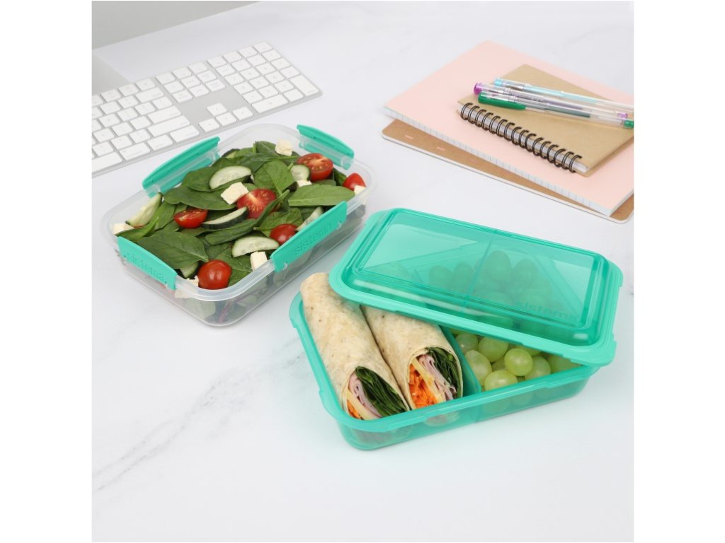 Eine Snackbox mit praktischer Inneneinteilung. Die Box besteht aus zwei Teilen (Unterteil und Deckel), wobei ein Teil durch eine feste Trennwand in zwei Hälften unterteilt ist. Unterteil und Deckel sind durch eine herausnehmbare Trennwand voneinander getrennt, die als Tablett oder Teller verwendet werden kann. Die Trennwand ist umlaufend versiegelt und schützt so zuverlässig Unter- und Deckel der Box. Nach dem Verzehr kann der farbige Deckel in das Unterteil eingesetzt und mit den Sistema-Schnappverschlüssen fixiert werden. Das spart Platz im Rucksack oder in der Tasche. Vorteile: • Zwei Fächer zur Trennung von Lebensmitteln • Der Deckel kann nach dem Verzehr in das Unterteil eingesetzt werden • Stapelbar • Robustes PlastikZusätzliche Parameter