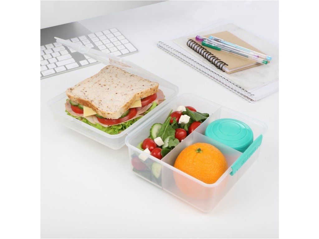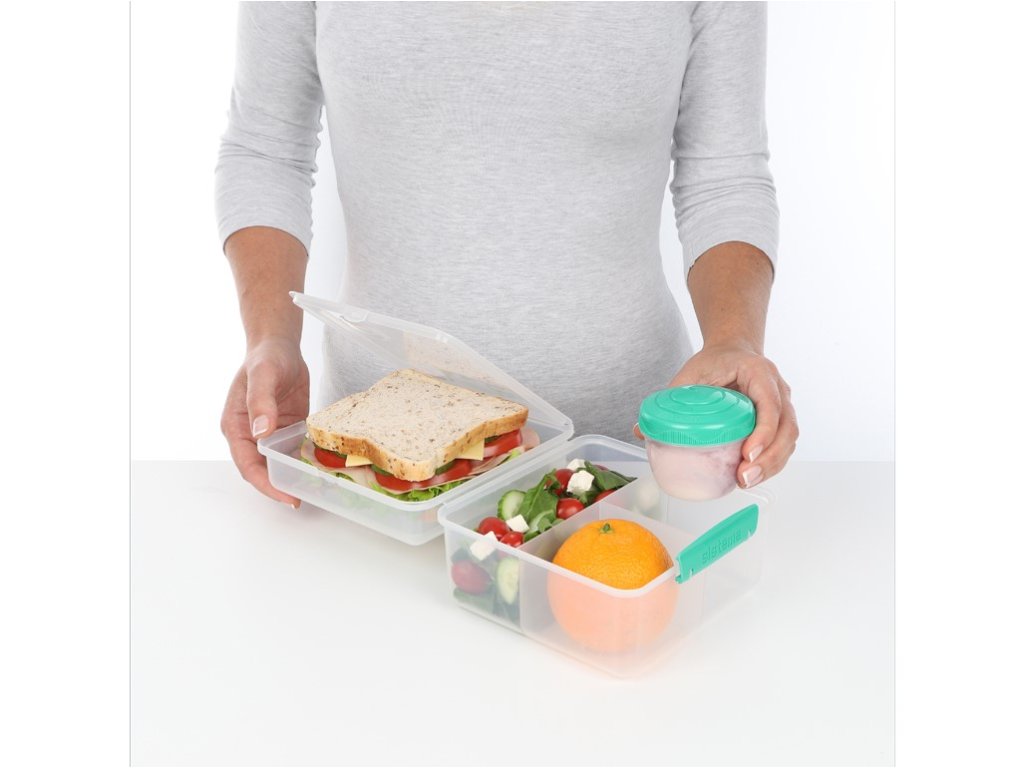 Die Box ist in drei Fächer unterteilt, sodass Sie verschiedene Lebensmittel getrennt aufbewahren und ein Vermischen verhindern können. So können Sie beispielsweise ein Sandwich, Salat und Obst in einem Fach transportieren. Die Box enthält außerdem einen 150-ml-Joghurtbehälter mit dicht schließendem Schraubverschluss, der sich ideal zur Aufbewahrung von Joghurt, Müsli, Pudding oder anderen flüssigen Lebensmitteln eignet. Vorteile: Drei Fächer, Joghurtbehälter, DoppeldeckelZusätzliche Parameter