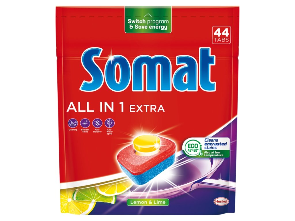 Somat All-in-1 Extra Geschirrspültabs für strahlend sauberes Geschirr auch bei Kurz- und Eco-Programmen mit niedrigen Temperaturen! Erleben Sie die effektive Spülkraft mit Somat All-in-1 Extra Geschirrspültabs.