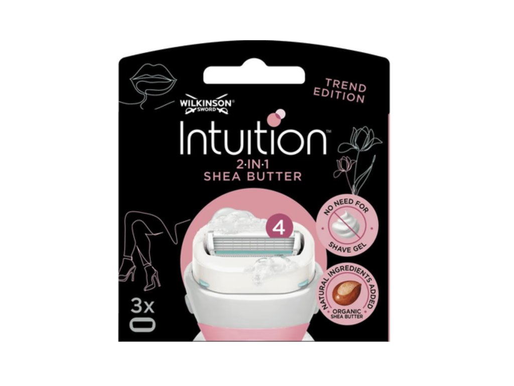 Wilkinson Sword Intuition Sheabutter 3er-Set. 4 Ersatzklingen für Wilkinson Sword Intuition Rasierer sind mit cremiger Mandelseife, Aloe Vera und Vitamin E angereichert. Kein Schaum oder Gel nötig. Schäumt, rasiert und spendet Feuchtigkeit in einem Schritt! Der schwenkbare Rasierkopf folgt den Körperkonturen und entfernt Haare ganz ohne Schaum oder Gel. Vier Klingen mit einem feuchtigkeitsspendenden Seifenstück mit Sheabutter, das die Haut weich macht und mit Feuchtigkeit versorgt. Hypoallergen, paraben- und parfümfrei. Dermatologisch getestet.